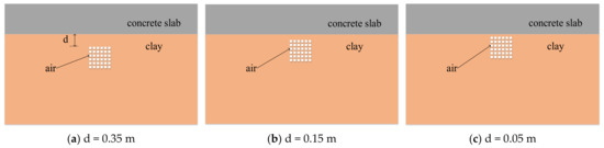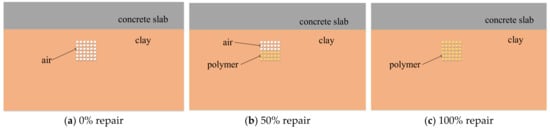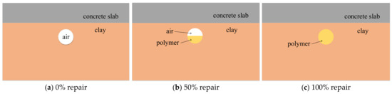 Different center frequencies of ground-penetrating radar are suitable for different detection depths. When the center frequency is 900 MHz, the detection depth is 1–2 m, which is more suitable for the actual conditions of the diseases in this paper. According to the previous research, the reflection hyperbola with a radius of 0.05 m cave can only appear in the upper layer without stratification [38]. Therefore, 0.05 m is taken as the minimum detection size of ground-penetrating radar in this paper. The polymer and clay are mixed in practical engineering. The equivalent dielectric constant of the mixtures is generally considered as a function of the dielectric constant of each component and its volume content. Empirical models such as the Rayleigh model and CRIM model are often used to estimate the equivalent dielectric constants of mixtures [39]. Due to the complex way of adding the equivalent dielectric constant of mixed medium, all the dielectric layers are assumed to be a uniform medium in this paper. When the medium in the cave is air or water, the polymer will not mix with the clay and the dielectric constant of the polymer is used in those cave areas after repair.