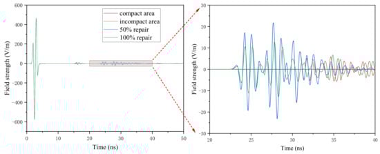 As shown in Figure 7, the A-scan images of the compact area model does not generate reflected waves after passing through the interface between the concrete and clay mediums. The reflection waves of the air-filled cave appear near 17 ns, 23–24 ns, and 27–28 ns in before repair, the reflection waves of the air-filled cave appear near 17 ns, 23–24 ns and 26 ns in 50% repair, and the reflection waves of the air-filled cave appear near 17 ns, 23–24 ns, and 31–32 ns in 100% repair. The reflection wave near 17 ns is due to the encounter of the interface between concrete and clay. The reflection wave near 23–24 ns is due to encountering the air-filled cave upper interface. For 100% repair, the reflection coefficient of the air-filled cave upper interface is least than that of 0% repair and 50%repair, so the amplitude of the reflection waves are least than that of 0% repair and 50% repair. For 0% repair and 100% repair, the reflection waves near 27–28 ns and 31–32 ns are the lower interface, respectively. For 50% repair, the reflection waves near 26 ns are the interface between air and polymer and are close to the upper interface of the air-filled cave, and the reflection phenomenon is not obvious.