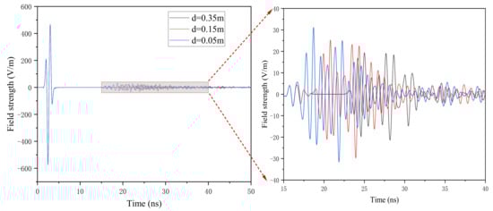 Figure 12 and Figure 13 show that the distance between the center point of the incompact area to the dam surface gradually decreases, the top of the curve in the forward simulation profile moves upward, the amplitude of the curve becomes larger, and the time of generating single channel reflection wave is gradually advanced. The reflection wave that is generated in the incompact area is adjacent to the reflection wave on the surface of the concrete and clay medium when d = 0.05 m. Therefore, we should pay attention to distinguish the reflection waves when the incompact area is close to the interface of concrete and clay in the actual project.