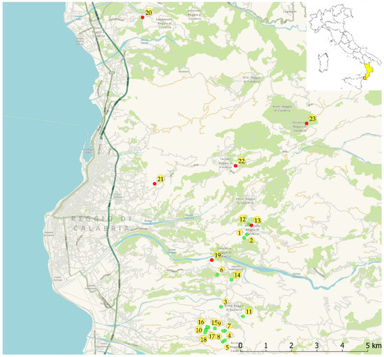 Distribution of Salvia ceratophylloides Ard. near Reggio Calabria (RC), Calabria region (S-Italy). In green are the micro-populations currently present, in red those that are extinct. 1—Serro Ciugna, Mosorrofa; 2—Serro Ciugna, Mosorrofa; 3—Spilingari, Armo; 4—Contrada S. Todaro, Aretina; 5—Contrada S. Todaro, Aretina; 6—Serro dei Morti, Puzzi fraz. di Gallina; 7—Prai, Aretina; 8—Prai, Aretina; 9—Aretina; 10—Aretina; 11—Grotta di S. Arsenio, Armo; 12—Mosorrofa vecchio; 13- Mosorrofa vecchio (exstinct in 2019); 14—Serro d’Angelo, Puzzi fraz. of Gallina; 15—Prai, Aretina; 16—Prai, Aretina; 17—Serro della Cattina, Aretina; 18—Serro della Cattina, Aretina; 19—Lutrà, Fiumara di Sant’Agata; 20—Galluzzi, Gallico Superiore; 21—Pietra Storta; 22—Croce Missionaria, Terreti; 23—Fontana Acqua Fresca, Straorino.
