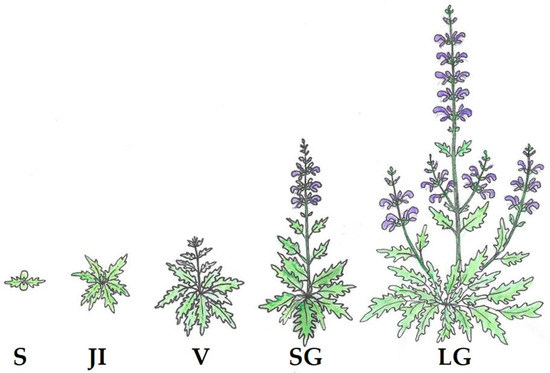 “Life stage” of Salvia ceratophylloides Ard. (S = seedling; JI = Juveniles/Immatures; V = Vegetative; SG = Small Generative; LG = Large Generative). Life stages are according to [11], the original pictures have been drawn by V.L.A. Laface.