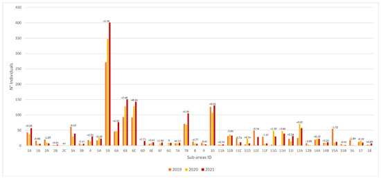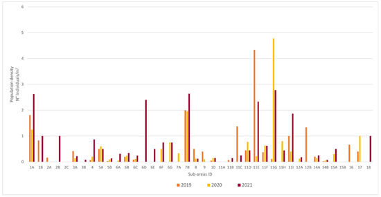 The graph (Figure 6) shows that the different sub-areas had different population densities in different years. Some of the sub-areas showed an increasing trend (1A, 2B, 4, 5A, 5B, 6A, 6B, 6C, 6E, 6F, 7A, 7B, 10, 11A, 11B, 11I, 12A, 14A, 14B, 18), others showed a decreasing trend (1B, 2A, 2C, 3A, 3B, 8, 9, 11C, 12B, 17) and some had strong fluctuations from year to year, being those most directly impacted by human activities (6D,11E, 11F, 11G,11H,15A, 15B, 16). Sub-area 6G (discovered in 2020) was constant over the years.