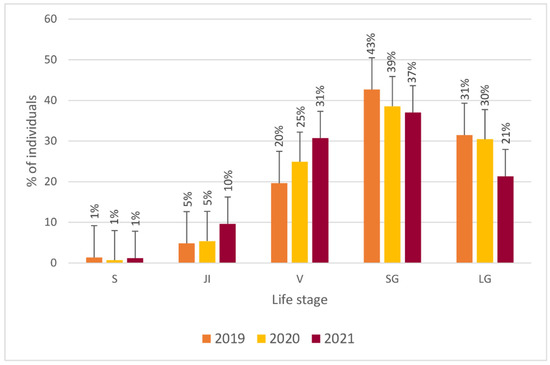Distribution (%) of “life stages” of Salvia ceratophylloides Ard. between 2019, 2020 and 2021 (Error bars represent standard deviations).