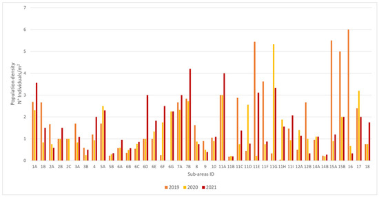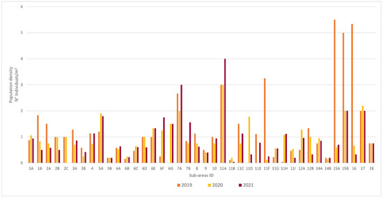 To confirm the previous results, the population density was estimated in relation to total individuals, distinguishing them as non-breeding and breeding individuals in the 3 different years in relation to the areas considered for each sub-area (Table S1).