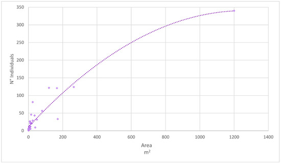 The graph of average numbers of individuals/area of the sub-areas over the three years (Figure 7) shows that as the area increased, the number of individuals increased, with a maximum of 340 individuals over an area of 1200 m2 in sub-area 5B.
