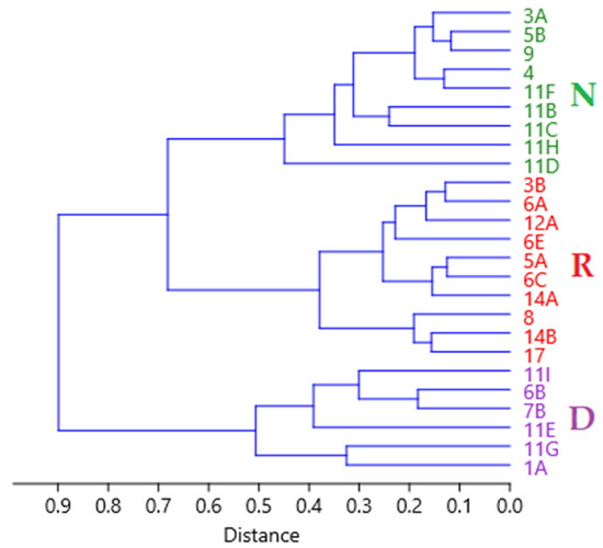 Dendrogram of population classification related to “life stage” of Salvia ceratophylloides Ard. The abbreviations refer to the sub-areas shown in Table S1. In green, populations classified as “Normal”—N; in red, “Regressive”—R; in purple, those classified as “Dynamic”—D.