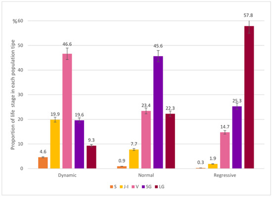 Population structure of Salvia ceratophylloides Ard. Three population types (“Dynamic”, “Normal” and “Regressive”) were distinguished in accordance with clustering analysis. The percentage of individuals in relation to the total population type is given for each “life stage”. Error bars represent standard deviations.