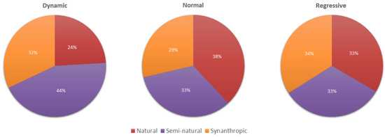 Overall, a certain relationship was observed between the characteristic species of the various vegetation classes (natural, semi-natural, synanthropic) and the population types (“Regressive”,” Dynamic”, “Normal”) (Figure 15). In particular, species typical of the natural type classes were well represented in the “Normal” populations, while species typical of the semi-natural vegetation classes were better represented in the “Dynamic” type populations and, finally, albeit slightly, species typical of the synanthropic vegetation classes were better represented in the “Regressive” type populations.