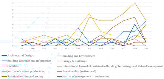 Sustainable buildings have drawn increasing attention in research and practice [43], see Figure 3 where the coloured lines show the number of published papers per journal each year.