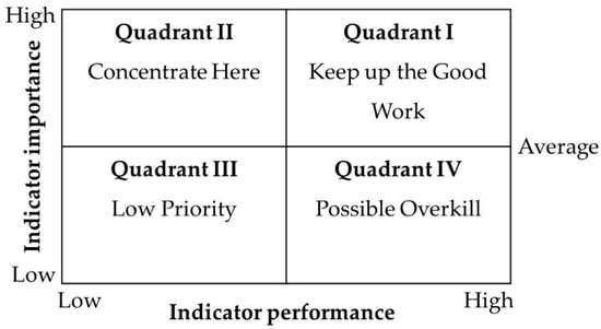 After that, IPA was applied in the study, as described by Martilla and James [], to map the data to the IPA grid. In this grid, the I-P mean scores for PWM solutions are plotted on the vertical and horizontal axes, as depicted in Figure 2. The X-axis illustrates citizens’ perceptions of the performance, while the Y-axis illustrates their view of an attribute’s importance with respect to the indicators of PWM solutions. Indicators in quadrant I (Keep up the good work) are rated as “very important” by respondents, so responsible organizations must ensure they maintain their current level of performance, at a minimum. Indicators in quadrant II (Concentrate Here) are perceived by the respondents as “very important but performing poorly”. This indicates that improvement efforts should be concentrated on indicators located here. Indicators in quadrant III (Low Priority) are perceived by respondents as “less important” and their performances level is likewise fairly low. Quadrant IV (Possible Overkill) contains indicators that are not perceived as important, but their performance is nonetheless assessed to be good by respondents. As a result, the location of each indicator clearly shows the properties of specific PWM solutions as perceived by citizens.