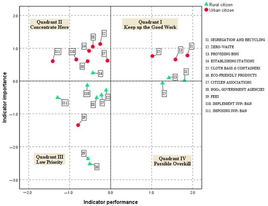 A visual analysis of the IPA rating grid plots across the four quadrants for the proposed PWM solutions, shown in Figure 3, shows the relative strengths and weaknesses of the indicators of I-P. Based on the views expressed by urban citizens, indicators I1, I3, and I5 were located in quadrant I. These findings imply that environmental managers and policymakers should continue to maintain their current performance in order to meet the goal of advancing sustainable PWM in the near future. On the other hand, there were seven indicators assigned to quadrant II based on urban citizens’ ratings; namely, “zero-waste”, “establishing stations”, “eco-friendly products”, “citizen associations”, “NGOs, government agencies”, “implement SUPs ban”, and “imposing SUPs ban”. Evidently, most urban citizens believe that there is room for improvement in the performance of these PWM solutions, and that a combination of these solutions should be implemented in the future. This points to the fact that providing the PWM performance for a sustainable development strategy must be considered a top priority. Only the indicator “fees” (code I9) was located in quadrant III (Low Priority) by this cohort, which means urban citizens perceived this indicator to be relatively unimportant and also felt this solution was not performing well. Similarly, the I-P analysis of rural citizens also showed that two indicators were located in quadrant I, one in quadrant II, seven in quadrant III, and one in quadrant IV (Figure 3). Various indicators were determined to fall within quadrant I, indicating that these solutions are perceived as very important and showing a high level of satisfaction with their performance. Therefore, managers should “keep up the good work” with regard to this indicator, continuing programs such as “segregation and recycling” (code I1), and “providing bins” (code I3). The indicator “establishing stations”, located in quadrant II, should be “concentrated” upon for improvement because it has high importance but low performance in the eyes of rural citizens. Martilla and James [] called the third quadrant “low priority”; accordingly, the indicators in this zone were considered relatively less important and their performances were lower than the mean score of other indicators. There are seven indicators in this quadrant in the present study, including “zero-waste” (code I2), “eco-friendly products” (code I6), “citizen associations” (code I7), “NGOs, government agencies” (code I8), “fees” (code I9), “implement SUPs ban” (code I10), and “imposing SUPs ban” (code I11). Finally, “cloth bags and containers” (code I5) was located in quadrant IV. The importance of this solution was deemed to be low, but it was considered to perform well, which could indicate overinvestment and a misplaced overabundance of concern with this measure.