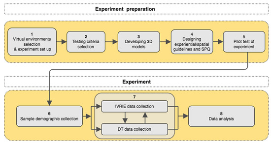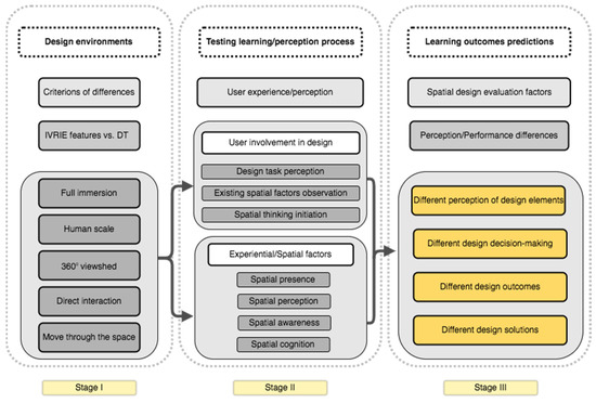 The experiment design of this study is based on a conceptual model for the experiment design, in which a tool/environment usage test would be conducted to compare the capability of transferring spatial data of a tool/environment to users. In addition, the differences in users’ spatial decision making and performance based on this spatial data transmission was recorded. The experiment design’s conceptual model, comprising three stages, is proposed by distinguishing five different key features of IVRIE from those of DT system in the first stage. The authors gathered these features from the literature review and pilot study results. As a design tool or design environment, IVRIE has five features important to this study: (a) full immersion, (b) a human scale and all other standard scales (e.g., 1:10, 1:100), (c) 360° viewshed without the need for a controller (by rotating the head, users can obtain an immersive view of their surroundings), (d) different and direct interactions with internal virtual design objects, and I the ability to move through the design. Different interactions mean the ability to interact with design objects by a mouse and one hand in DT system versus direct interaction in IVRIE using two hands and two controllers (or a pair of smart gloves). Other features such as immediate and real-time feedback have been considered common to both environments and thus are not considered here.