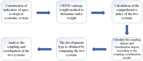 This research mainly comprised three steps: (1) constructing the evaluation index system; (2) using the CRITIC–entropy combination weight method to assign weights to the indicators; and (3) using the coupling coordination model to evaluate the coupling coordination degree of the agro-ecological economic system. Figure 2 consists of a flow chart describing the study: