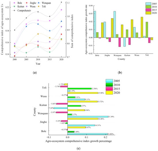 (a) Agro-ecosystem comprehensive index; (b) Agro-ecosystem growth rate; (c) Agro-ecosystem comprehensive index of growth percentage.