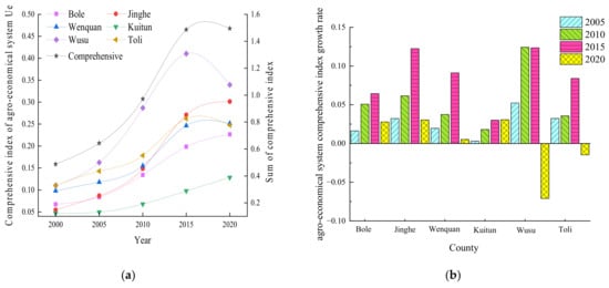 - From the perspective of the comprehensive index, the agro-ecosystem has developed slowly with little change over time, and the differences between counties (cities) are small. By 2020, the highest comprehensive index for the agro-ecosystem was obtained in Bole, at 0.216, with the lowest in Toli County, at 0.165. However, the agricultural economic system is developing rapidly, with large differences between the counties (cities). By 2020, the highest comprehensive index of agricultural economic system of 0.339 was obtained in Wusu, with the lowest of 0.126 in Kuitun; however, both counties show an upward process;