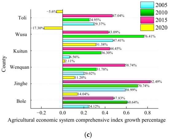 (a) Agricultural economic system comprehensive index; (b) Agricultural economic system growth rate; (c) Agricultural economic system comprehensive index growth percentage.