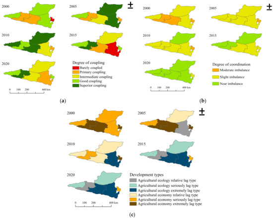 The development in each county (city) over the past 20 y from the perspective of the comprehensive index value, growth rate, coupling degree, coordination degree, and development types for the agricultural ecosystem and agricultural economic system were analyzed in this study.