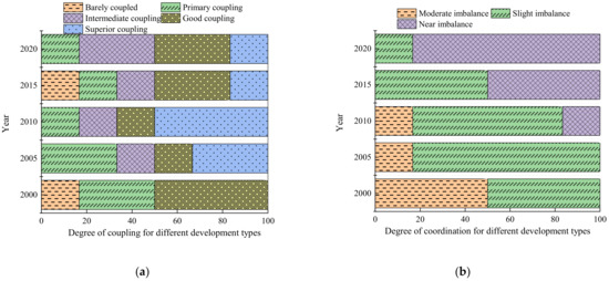 (a) Development types of coupling degree C proportion; (b) Development types of coordination degree D proportion.