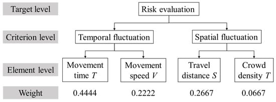 1. Construction of hierarchical structure. We construct a three-level structure model consisting of target level, criterion level, and element level. The fluctuation of pedestrians is mainly caused by the interference of external environments [44]. After being disturbed, pedestrians’ behavior fluctuates in temporal and spatial dimensions. The movement time and speed provide valuable information for behavior analysis [45] and reflect the degree of interference. Similarly, travel distance and crowd density intuitively describe the behavior state and reflect the influence of interference on pedestrian behavior [46]. Therefore, we choose movement time and speed to represent the temporal fluctuation, while travel distance and crowd density show the spatial fluctuation. We define the element level factors as indicators describing the pedestrian fluctuation (FI) acquired by dynamic information of pedestrians in stations. Figure 2 shows the hierarchy of risk evaluation.