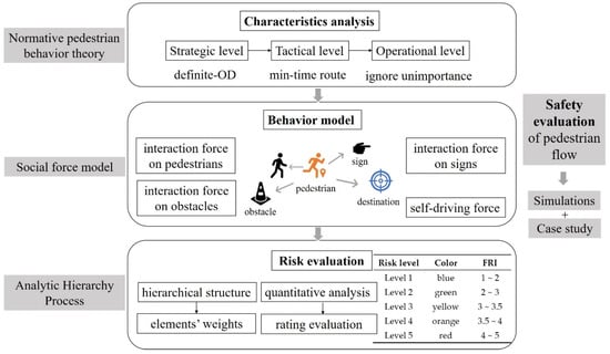 Our study considers the safety evaluation for pedestrian flow in subway stations, and the data flow chart of our research is shown in Figure 3. We elaborate on the characteristics of pedestrians on three levels based on the behavior theory. Applying these features, we define the partial impact dynamics in terms of four aspects and constrains the behavior model of pedestrians. Subsequently, the pedestrian risk is assessed using AHP based on real-time data. This method enables a practical judgment of pedestrian risks and helps appropriate decision-makers to take safety measures in advance.