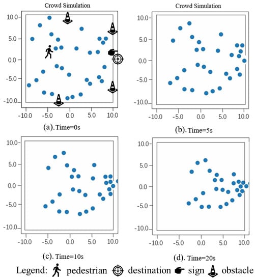Evolution of pedestrian behavior over time based on PI-SFM. The times were 0 s, 5 s, 10 s, and 20 s.
