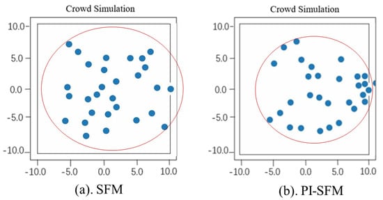 1. Verification of improved self-driving force. The PI-SFM considers the pedestrian characteristic of definite OD, making the self-driving force an essential factor driving pedestrians to move. As can be seen in Table 6, the average self-driving force of the PI-SFM is significantly higher than that of the SFM, suggesting that the PI-SFM better accounts for the self-driving force. Because the PI-SFM incorporates the OD factor affecting pedestrian speed, the correlation between speed and self-driving force is enhanced from weak to vigorous, reflecting the positive effect of self-driving force on speed. We also observe an increase in mean movement speed, but a decrease in the variance of pedestrian speed. The change in the measure of speed indicates that a strong self-driving force drives pedestrians to move toward their destinations with high speed and low-fluctuation walking behavior. Figure 5 shows the two models’ pedestrian-behavior range simultaneously. The range of pedestrian behavior is defined as the area covered by all pedestrians, showing in the red circles in Figure 5. It can be seen intuitively that the behavior range of the PI-SFM is significantly smaller than that of the SFM. In the PI-SFM, pedestrians tend to move closer to their destinations, being driven by the self-driving force. The number of pedestrians at the exit has increased, showing a gathering state. Therefore, it is clear that the improvement described in this paper with respect to self-driving force is reasonable and more consistent with the characteristics of pedestrians in subway stations.