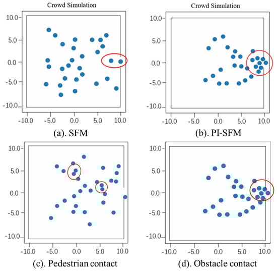 Crowd simulation in models. (a,b) show pedestrian behavior at the exit in the SFM and PI-SFM, respectively; (c,d) show pedestrian and obstacle contact behavior in the PI-SFM.