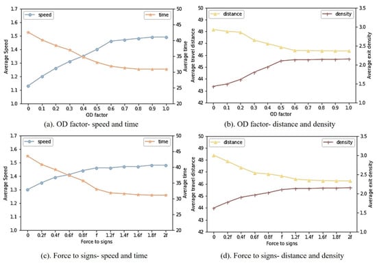 The sensitivity of measures to the OD factor is shown in Figure 7a,b. The average movement speed increases and movement time declines with increases in the value of the OD factor. On the other hand, the OD factor has a minimal effect on average travel distance and exit density. The change in the measures is more apparent when the OD factor is less than 0.5, while it is small when the OD factor exceeds 0.8 because pedestrian behavior is close to the optimal state in the latter case. Therefore, the OD factor expresses the pedestrian expectations concerning destinations and optimizes walking behavior by acting upon movement speed.