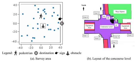 We carried out a simplified experiment in an actual subway station. The experiment was conducted at the Wuyi Square subway station in Changsha, Hunan, China, the largest interchange station in Changsha, which has high pedestrian flows. Within the Wuyi Square station, we selected an square as the survey area (with a column), where the destination was set as the turnstile ( in width) at the edge of the square. The sign was located at the goal (an erected instruction sign was placed at the turnstile). Figure 8a depicts an overhead view of the survey area, (b) shows the layout of the concourse level in the station. We tracked the behavior of 30 pedestrians walking in the same direction during the morning rush hour (7:00 am to 8:00 am) and recorded the time it took them to move through the survey area (arrival at the turnstile) and the number of steps they took. The study also counted the number of pedestrians in the survey area. The statistical results of the actual experiments are recorded in Table 7.