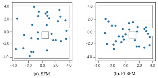 As can be seen in Table 7, the outputs of the PI-SFM are closer to the actual experiment results than the SFM. The PI-SFM effectively reproduces the movement of pedestrians in the subway station, indicating that it is consistent with the behavioral characteristics of real pedestrians. Specifically, the pedestrians of the PI-SFM have high movement speed because both the strong self-driving force and the force on signs drive them to rush. The PI-SFM corrects the forces on obstacles by reducing pedestrians’ detour distances and time delays of pedestrians, resulting in savings in average movement time and travel distance. The area density of the PI-SFM is significantly higher than that of the SFM, reflecting the ability of a given area to bear more pedestrians in busy periods, thus demonstrating the improvement in the forces on pedestrians. Figure 9 compares the simulation results of the two models simultaneously. We find that pedestrians in the PI-SFM are closer to obstacles and converge upon their destination, effectively reducing the range of movement. The PI-SFM truly reflects the actual movement of pedestrians in subway stations, which is guided by signs to move towards the target. The case study shows that the behavior model constructed and described in this paper matches the actual walking behaviors of pedestrians very well.