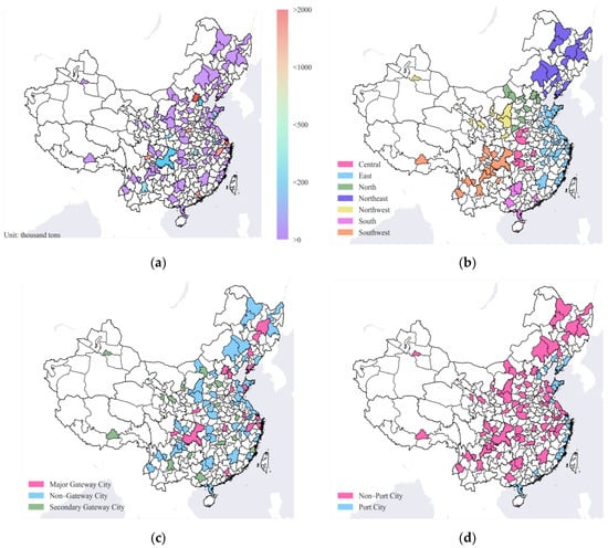 Sample city distribution maps. (a) Distribution of air cargo volume in 2019; (b) distribution of geographical areas; (c) distribution of administrative levels; (d) distribution of port cities.