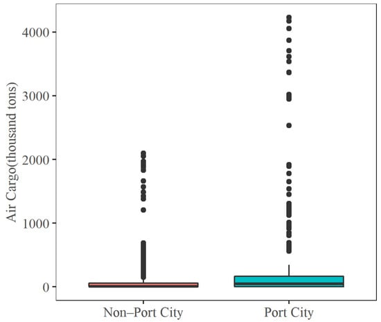 Box plots of air cargo volume of port cities and non-port cities.