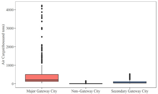 Box plots of air cargo volume of major gateway cities, secondary gateway cities, and non-gateway cities.