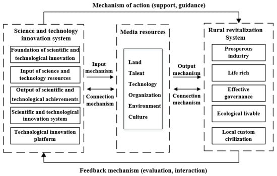 26]. At present, rural revitalization is facing many development challenges in areas such as industry, technology, ecology and governance, and it is urgent to support scientific and technological innovation. At the same time, the demand for and development of rural construction will also force the continuous improvement of scientific and technological innovation. From the perspective of resource factors, rural revitalization, in a sense, is the reorganization and optimization of agricultural and rural resources. The essence of scientific and technological innovation is to act on the rural revitalization system through land, talent, technology and other media resources. The two have a close dynamic coupling relationship to a certain extent and are manifested as an input and output mechanism, connection mechanism, action mechanism and feedback mechanism, as shown in