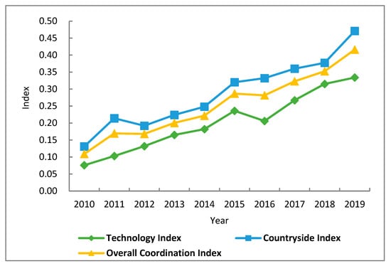 The synergistic development trend of science and technology innovation and rural revitalization is obvious. In terms of the development trend of coupling coordination, from 2010 to 2019, the coupling coordination level of the two systems gradually transitioned from mild imbalance to primary coordination, which means that the relationship between the science and technology innovation system and the rural revitalization system was becoming increasingly close, and the mutual promotion effect was gradually being enhanced. The synergistic development trend of the two systems is also obvious.