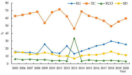 It can be seen from Figure 2 that each criteria layer has different effects on the high-quality development of the forestry economy. During the whole research period, the obstacle degree of technological change (TC) repeatedly showed a “declining-rising” trend, with constant fluctuation. Generally speaking, it decreased from 62.76% in 2005 to 59.74% in 2020. However, the degree of obstacles still ranked first, which had the greatest impact on the high-quality development of the forestry economy. Apart from 2013, the obstacle degree of economic growth (EG) and shared development (SD) ranked second and third, respectively. Ecological construction (ECO) had a minor effect on the high-quality development of the forestry economy, with an obstacle degree of less than 10%. The forestry industry is a part of ecological construction. It could mitigate climate change and achieve sustainable development by absorbing carbon dioxide and other greenhouse gases, which improves the ecological environment quality. In order to promote the high-quality development of the forestry economy, we should constantly promote technological change, improve the transformation of research achievements and promote the utilization rate of resources.