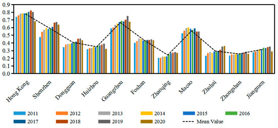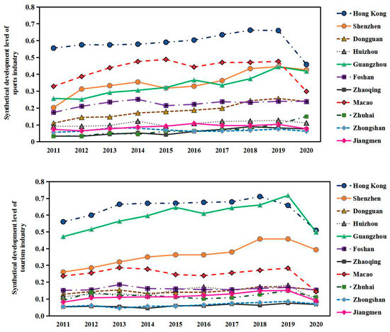 Based on the indicators data of the sports industry and tourism industry of 11 cities in GBA from 2011 to 2020, using the weight calculation formula in the entropy method, the weight of each indicator in the evaluating indicator system is obtained, as shown in Table 1. According to the calculation formula of synthetical development level of sports and tourism industries constructed above, the synthetical development level of two industries of 11 cities in GBA from 2011 to 2020 is obtained (Figure 1). To explore the regional differences in the convergence of the two industries, the urban agglomeration of GBA is further divided into three major areas: the east coast of GBA, the north coast of GBA, and the west coast of GBA. Among them, cities on the east coast of GBA include Hong Kong, Shenzhen, Dongguan, and Huizhou, cities on the west coast of GBA include Macao, Zhuhai, Zhongshan, and Jiangmen, and cities on the north coast of GBA include Guangzhou, Foshan, and Zhaoqing [42].