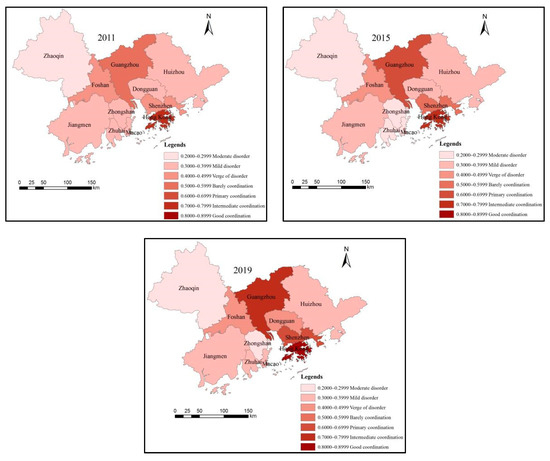 According to the coupling coordination degree model, the convergence degree of two industries in 11 cities of GBA from 2011 to 2020 is shown in Figure 2. From the perspective of the development trend of the convergence of sports and the tourism industries, except for the decline in 2020 due to the impact of the COVID-19 pandemic, the overall industrial convergence of urban agglomeration in GBA has shown an increasing trend. The spatial-temporal evolution of convergence development shows a gradual decrease in the layers from the inner to the outer circle with Hong Kong, Guangzhou, Shenzhen, and Macao as the core.