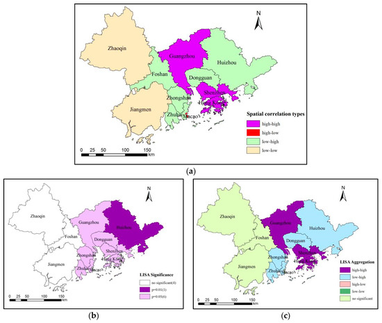 The Local Moran’s I test of convergence development in urban agglomeration of GBA in 2019. (a) Spatial correlation types map. (b) LISA significance map. (c) LISA aggregation map.