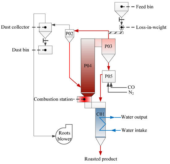 The pilot-scale test system (Figure 1) is composed of a feeding system, preheating system, dust collector, reduction system, cooling system, and a central control system. The raw material is preheated using a cyclone preheating (P02) system. Then, the ore enters the heating system (P04), which contains a strong oxidizing atmosphere. After reaching the predetermined temperature, the ore travels under the action of gravity into the reduction system (P05), where there is a strong reducing atmosphere. The material then stays in the reduction system for a certain amount of time before entering the fluidization cooling system (C01). The cooled material is mixed and condensed for magnetic separation. Power for the system comes from the roots blower, and the heat source mainly comes from liquefied gas combustion. The reaction temperature is adjustable between 500 °C and 650 °C. The feeding speed is fixed at 110 kg/h. The reductant is high-purity CO, and the CO concentration is adjusted with N2 gas flow.