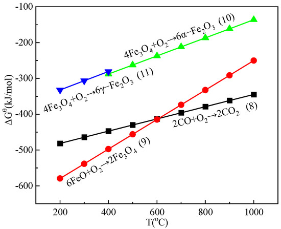The lower the position of the reaction in the Ellingham diagram, the more easily the reaction occurs. As can be seen from Figure 2, Reactions (8) and (9) intersect at 608 °C, so when t < 608 °C, Reaction (9) is the dominant reaction, and when t > 608 °C, Reaction (8) is the dominant reaction. Reactions (8) and (9) do not intersect at 400 °C, which may be due to the fitting of Gibbs free energy to = A+BT form, but this does not affect our judgment on the reaction trend. Reactions (8) and (9) are lower than Reactions (10) and (11), indicating that Fe3O4 is not easily oxidized without excessive oxygen.