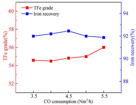 At 110 kg/h, the theoretical dosage of CO required is 3.54 Nm3/h (calculated according to Reactions (11) and (12)). As shown in Figure 4, with an increase in CO consumption from 3.5 Nm3/h to 5.5 Nm3/h, the TFe grade of iron concentrate increased from 54.58% to 56.01%. The iron recovery rate initially increased and then decreased. This may be due to the increase in reducing gas, which led to less residence time of materials in the reactor, thus affecting the iron recovery rate. Hence, the optimal CO consumption was determined to be 4.5 Nm3/h, with TFe grade and TFe recovery rates of iron concentrate are 54.82% and 92.46%, respectively. Under such conditions, the excess coefficient of CO is 27%, with the excess CO being introduced into the furnace for combustion, ensuring safety, and saving energy.
