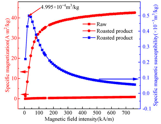 The magnetic properties of raw ore and roasting products were tested, and the results were shown in Figure 8. The specific magnetization of the raw ore is nearly a straight line, indicating that the raw ore is a weak magnetic mineral. The magnetization of roasted products increased significantly with the increase in magnetic field strength. At a magnetic field strength of 30.97 kA/m, the maximum specific magnetization was 4.995 × 10−4 m3/kg. This demonstrates that suspension roasting enhances the magnetic properties of minerals, which is beneficial to iron ore separation.