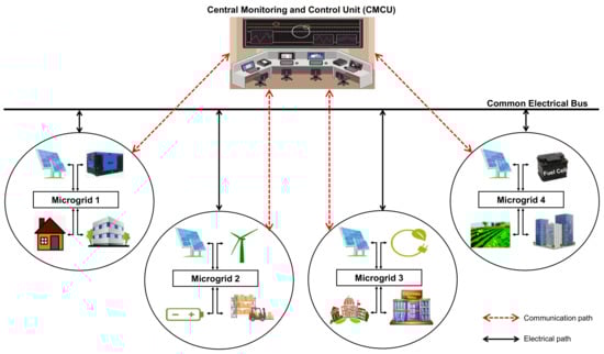 Figure 1. Here, all the microgrids are connected to a common electrical bus for energy transactions (import or export) among them. Similarly, all the microgrids are connected to the CMCU for communication exchange (data and control transmission). Various sources and loads associated with each of these microgrids are given in