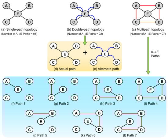 Figure 2f–l shows all the possible paths between nodes A and E. From this, it is observed that there are seven possible paths between A and E for communication in the proposed case; whereas, it was only one in single-path topology, and only two in double-path topology. This is the major benefit of the proposed multipath topology. In the multipath topology, to reach node E from node A (for example), the seven available paths are: A → E, A → C → E, A → C → D → E, A → C → D → B → E, A → B → E, A → B → D → E, A → B → D → C → E.