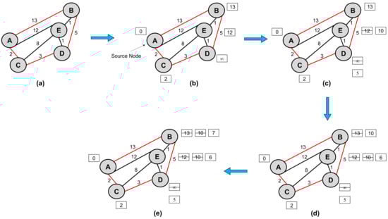 Figure 10b. Out of these two paths, the path with a cost of 12 is selected for communication establishment, as it is the least cost path. On the other hand, in the case of multipath topology, seven possible paths exist to reach from node A to node E, which are: A → E:12; A → C → E:10; A → C → D → E:6; A → C → D → B → E:11; A → B → E:14; A → B → D → E:19; and A → B → D → C → E:29, as shown in