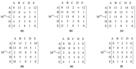 Repeat the above step for each of the other nodes as an intermediate node and calculate the matrices as shown in
