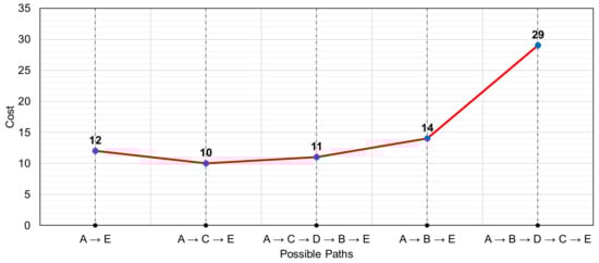 Figure 8, from which it can be noted that for the considered case, path A → C → E, with a cost of 10, is the shortest among all other possible paths.