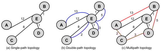 To prove the importance of the proposed enhanced Dijkstra algorithm over the conventional Dijkstra algorithm, graphs of single-path topology, double-path topology, and the proposed multipath topology, are considered, as shown in