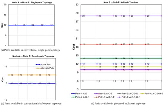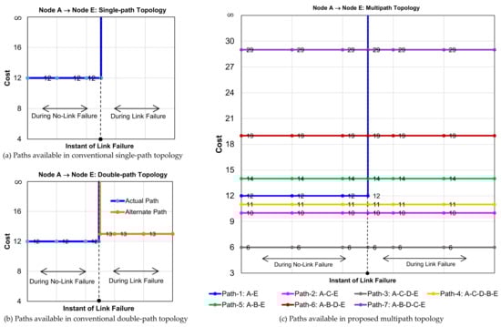 Figure 11b. On the other hand, in the case of multipath topology, even though the direct link A → E failed, communication between node A and node E is continued through the path A → C → D → E (with a cost of 6), which is the same as when there is no link failure. As shown in